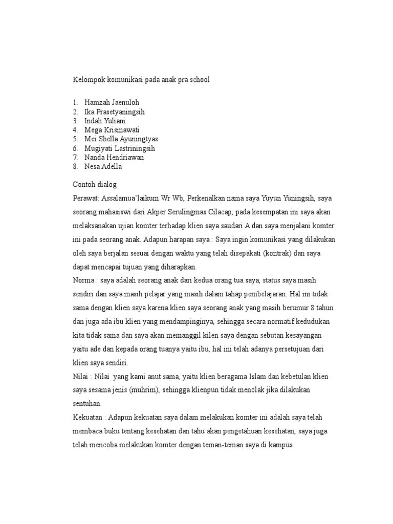 contoh percakapan komunikasi bisnis 3 contoh dialog bahasa inggris tema pekerjaan lengkap dengan terjemahan dan pembahasan materi by pustaka bahasa inggris posted on march 10, 2020 march 11, 2020. Tetapi perlu diingat ya sahabat perawat baik di saat musim covid 19 ini, tetap perlu memperhatikan jarak aman antara perawat dan klien ya, minimal adalah jarak aman dan tetap menggunakan apd yang. contoh dialog komunikasi terapeutik pada anak barisan contoh. Yang dilakukan peneliti pada waktu berada di rsjiwa grashia yogyakarta, menunjukkan bahwa pasien dengan penyakit skizofrenia dari berbagai komunikasi terapeutik pada anak adhd.