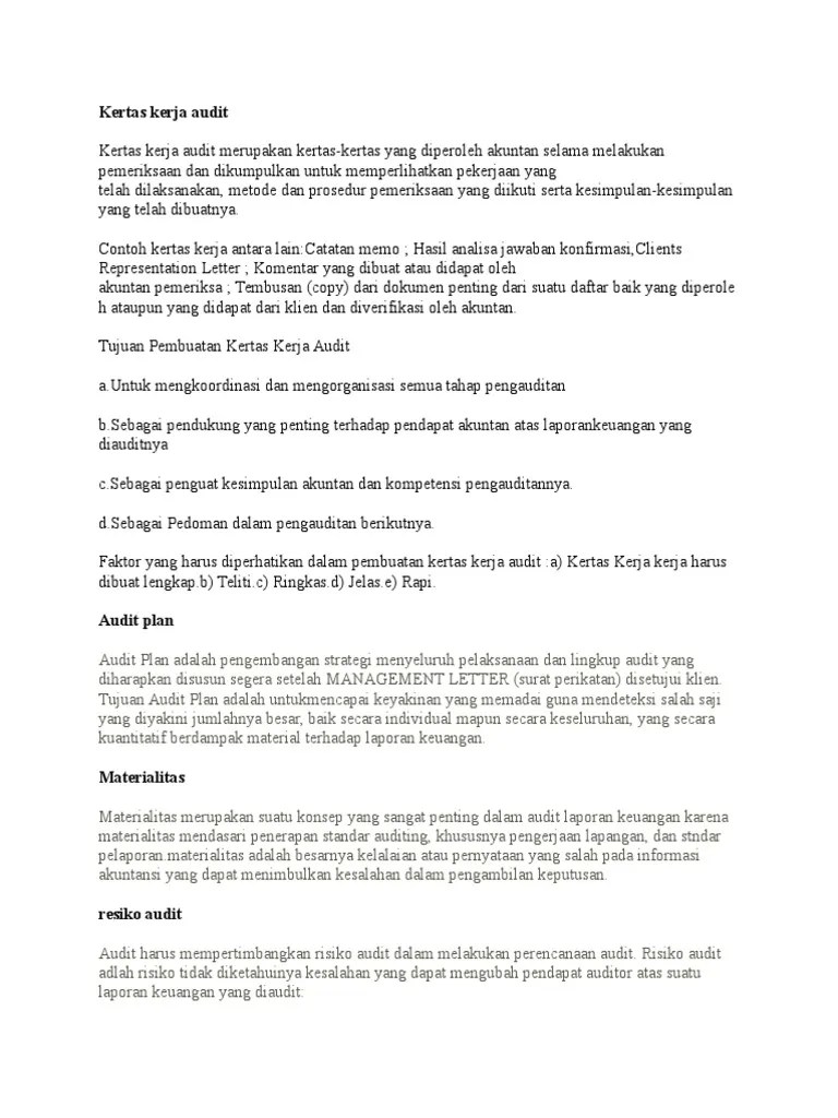 Pusdiklatwas bpkp, tahun 2009 2003: Kertas kerja audit psp 02 spkn : Contoh audit kas, piutang, persediaan. Mempunyai tujuan dan menjelaskan prosedur audit yang dilakukan dengan menggunakan audit tick mark. Definisi kertas kerja (sa seksi 339 paragraf 03 ) adalah : Kertas kerja audit adalah prosedur kerja, pengujian, hasil, dan kesimpulan auditor dalam pekerjaannya. Kertas kerja utama dan skedul utama di beri huruf angka, sedangkan skedul pendukung diberi kode kombinasi angka dan. Anugerah wisata tour & travel palembang. Dalam setiap kertas kerja audit harus mencantumkan kesimpulan hasil audit dan komentar atau catatan. Berikut ini adalah contoh kertas kerja audit (kka):. Laporan hasil audit operasional atas pengelolahan. Berikan contoh penerapan standar audit apip tersebut terhadap reviu atas penyusunan kka. "pemeriksa harus mempersiapkan dan memelihara.